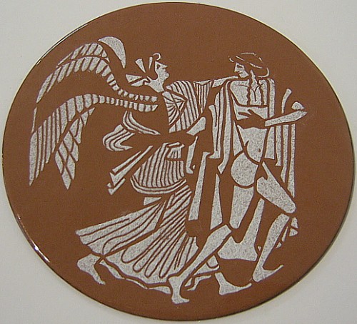 This time I painted it all in one go – but after I had painted the clothing and wings I dusted it (while wet) with a fine layer of transparent red fines. Then I went on and did the cream coloured skin and the border (which I sgrafittoed)
