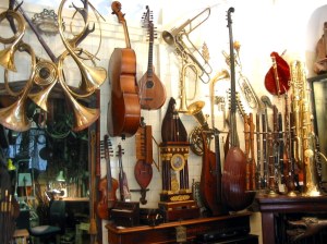 The square is surrounded by the covered walkways you see behind me where there are some VERY exclusive art galleries and you can pay EVEN more for you coffee than we did at the Deux-Magot! We didn’t bother with coffee – but we did go into a few of the galleries, and just off the Place itslef, we stumbled on this great Music Shop that Maria had mentioned having visited on a previous visit.