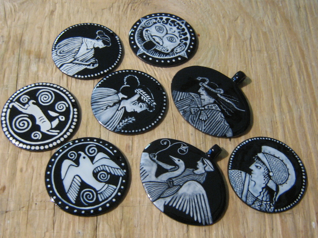 With the painted pieces I prepare up to 20 pieces with the black undercoat (2 firings on each side of the shape) but then I only paint as many pieces as I can finish in a day: three with grisaille and five or six of the Greek series.