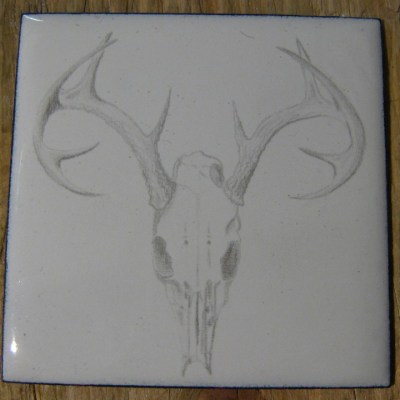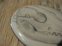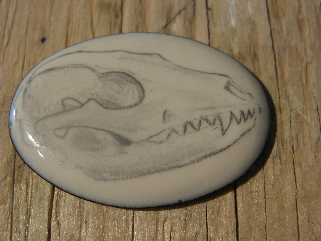 I started with sketches on paper but am now moving to enamel. Graphite (just simple pencil) can be fired into a coat of enamel retaining all of its characteristics except it’s fragility!  Once fired the drawing will last forever, and never fade. Rather than try to make this a really unified series, I am approaching each skull in a different way – sometimes making jewelry, sometimes framed pieces, sometimes on a white background, sometimes on bone or eggshell…